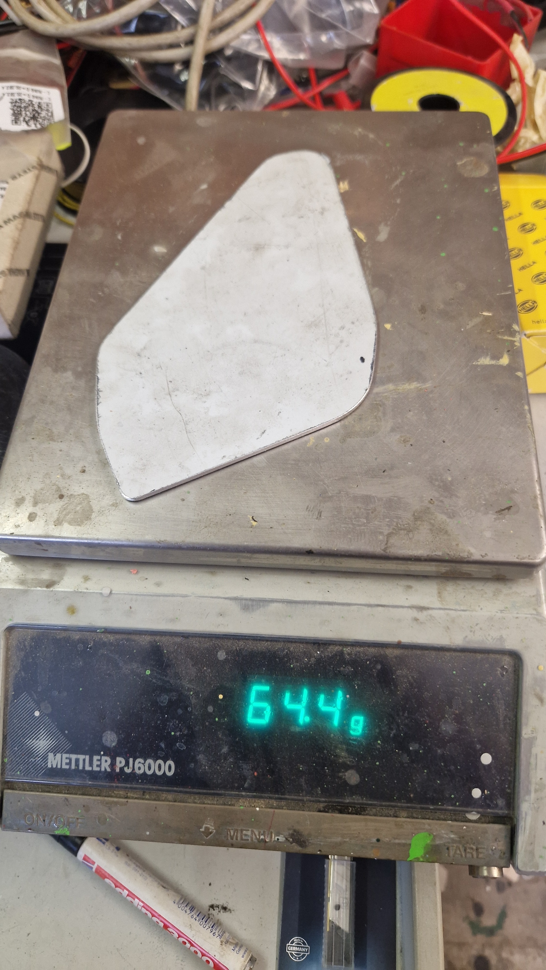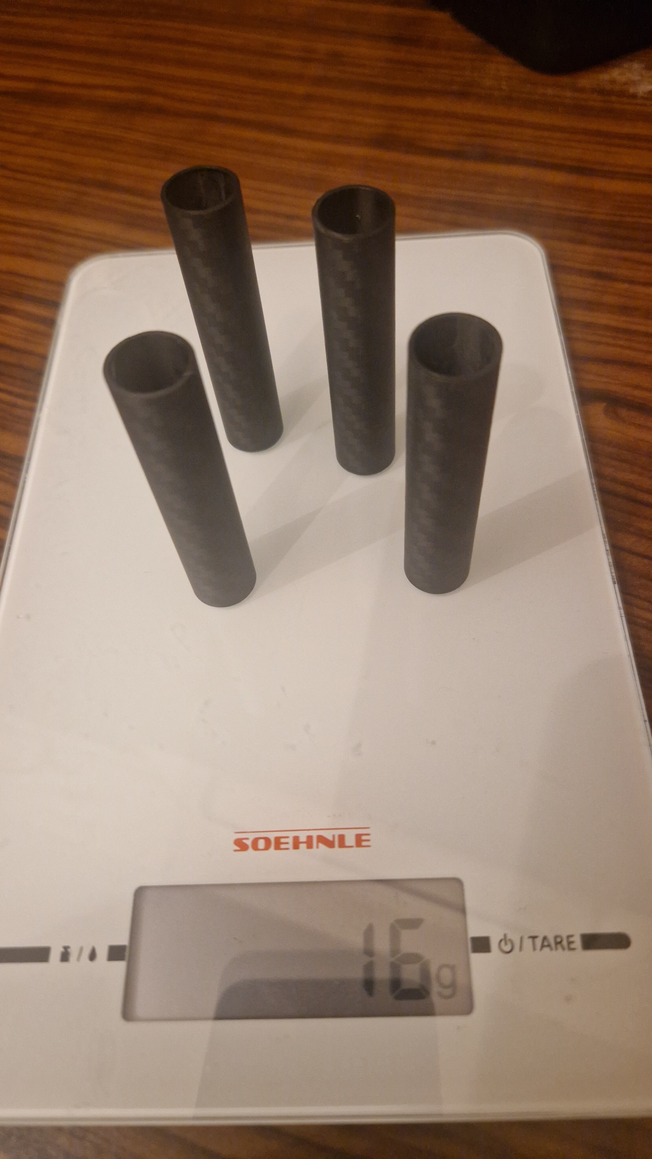 Die Waage meinte ziemlich genau 75gr. Pro Stück. 4 davon gibt es. Macht 296,6gr. 4 dünnwandige Alurohrabschnitte mit 64mm Länge erfüllen den selben Zweck.